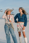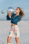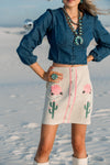 We're utterly obsessed with these retro style suede skirts. Soft light camel suede is elevated with flamingo pink piping, floral accents and cactus embellishments. Includes a decorative row of buttons.